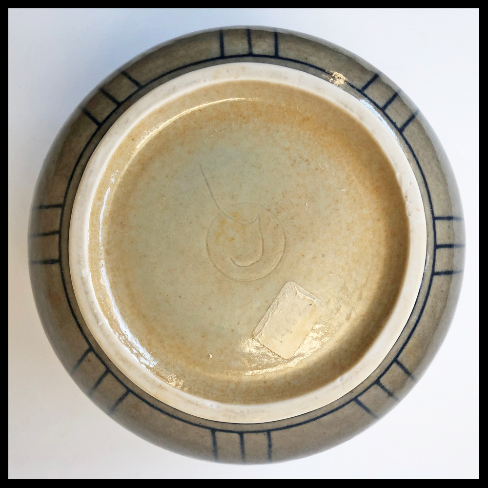 Leen Quist (NL), dekselpot, porselein, op de schijf gedraaid, afgedraaide voet, zeldzame kleur taupe met blauwe geometrische lijnen, hoogte 16 cm, diameter 14,2 cm, ingekraste signatuur, 1986. Door de eerste eigenaren aangekocht bij Galerie Rob van den Doel te Den Haag.