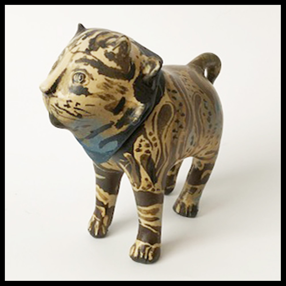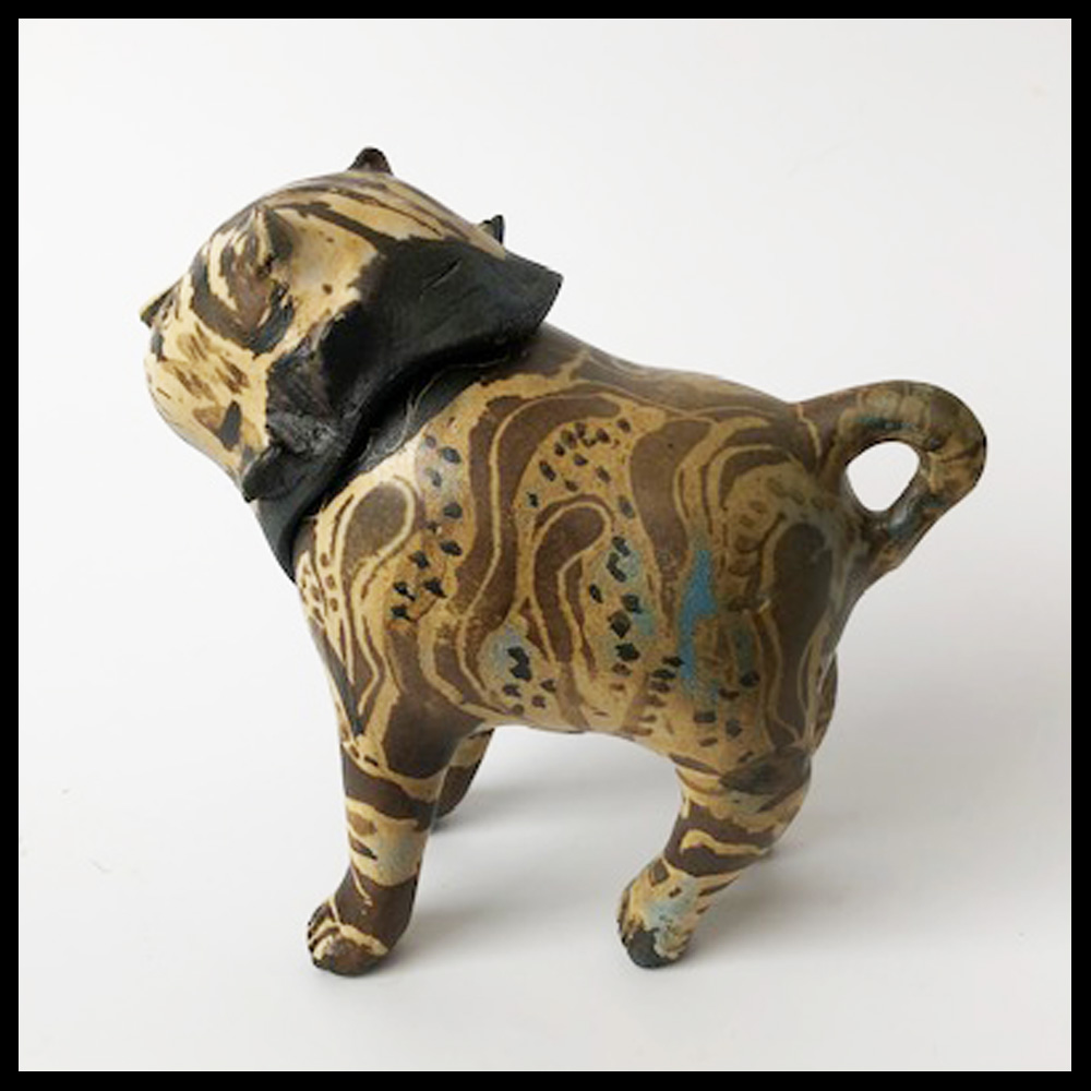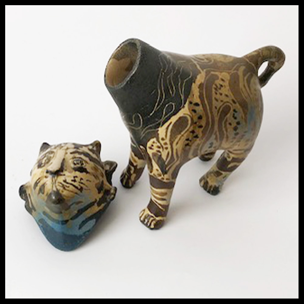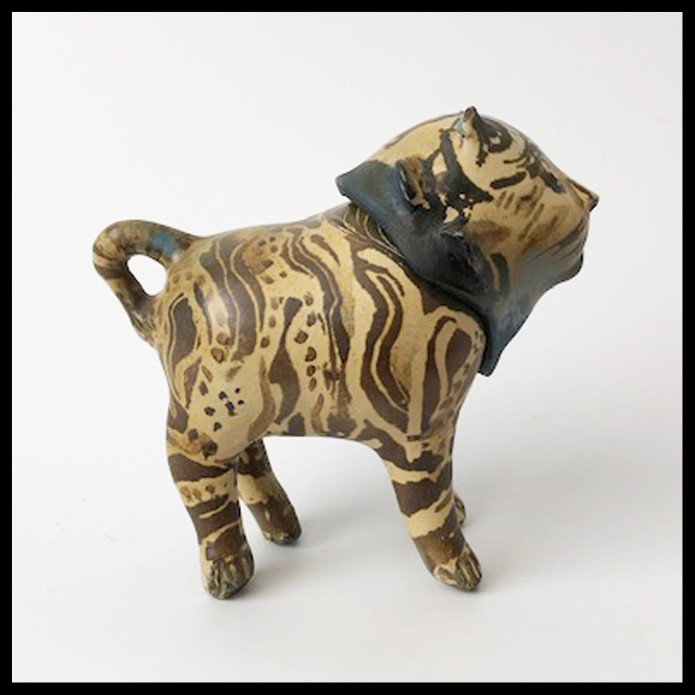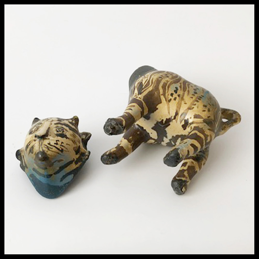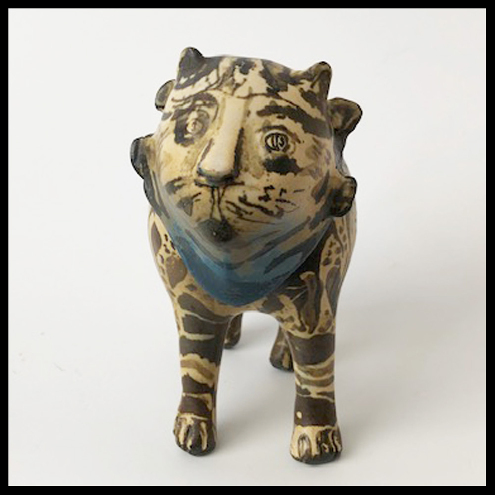 Lies Cosijn (NL), met de hand gemodelleerd fantasiebeest, losse opschuifbare kop, steengoed, geschilderde huid en blauwe engobe details, hoogte 15 cm, lengte 16,4 cm, circa 1990.