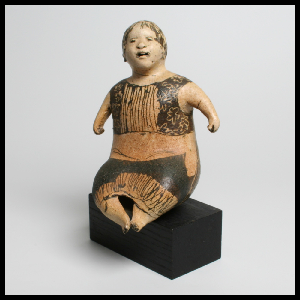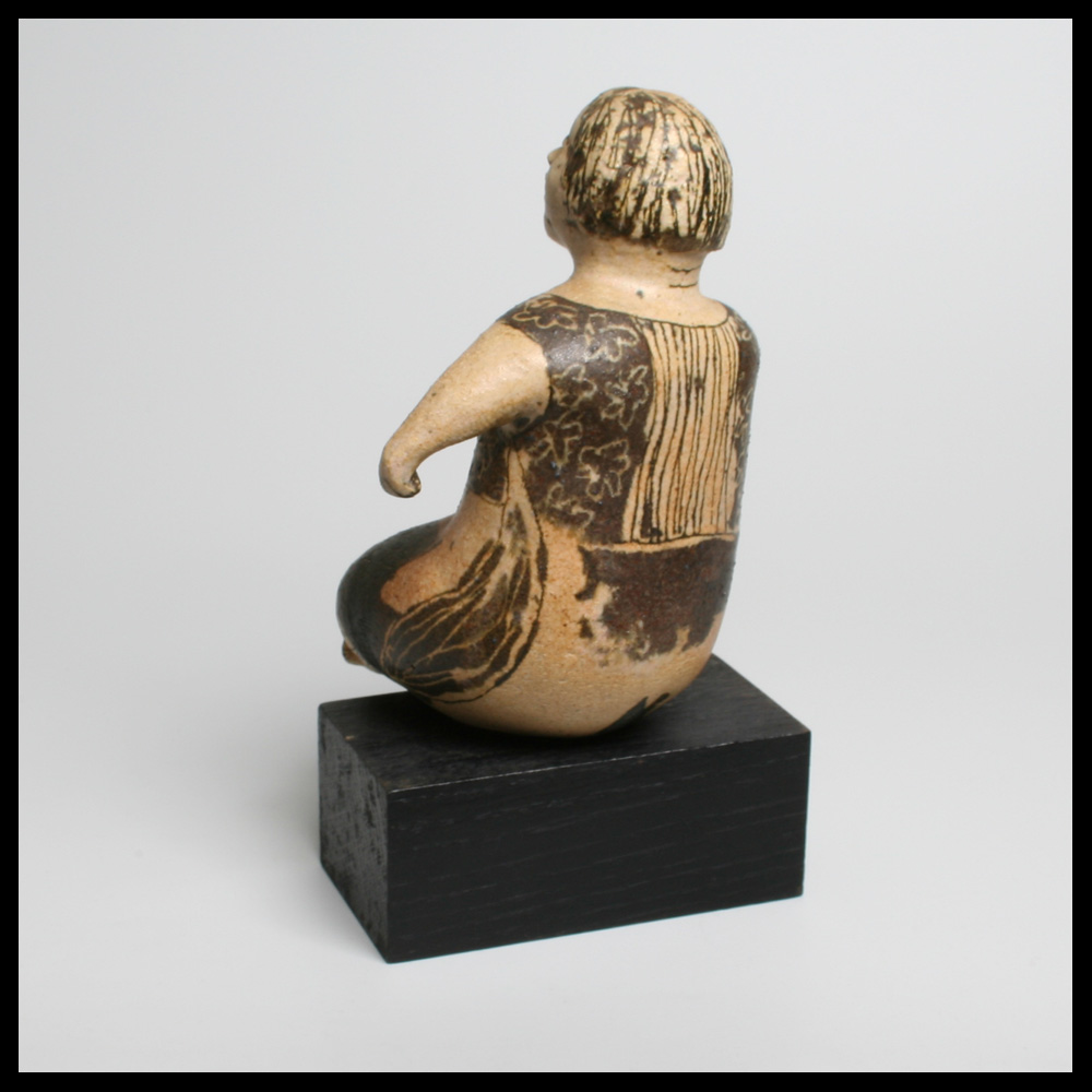 Zittende vrouw met kort haar, sinterengobe, steengoed, 1975-1980. Hoogte 16,5 cm. Dit object is op 26 juni 2014 verkocht aan Keramiekcentrum Tiendschuur Tegelen.