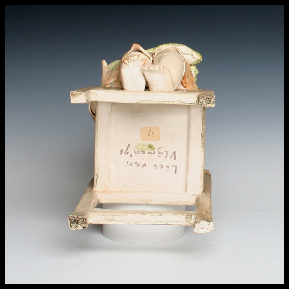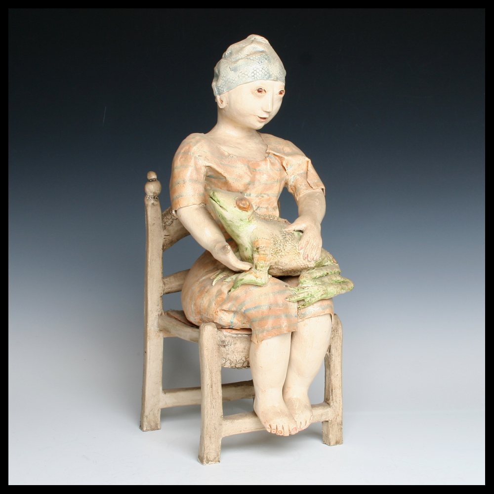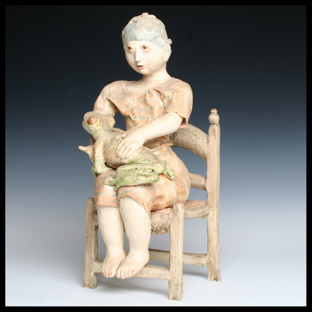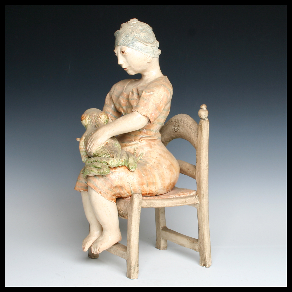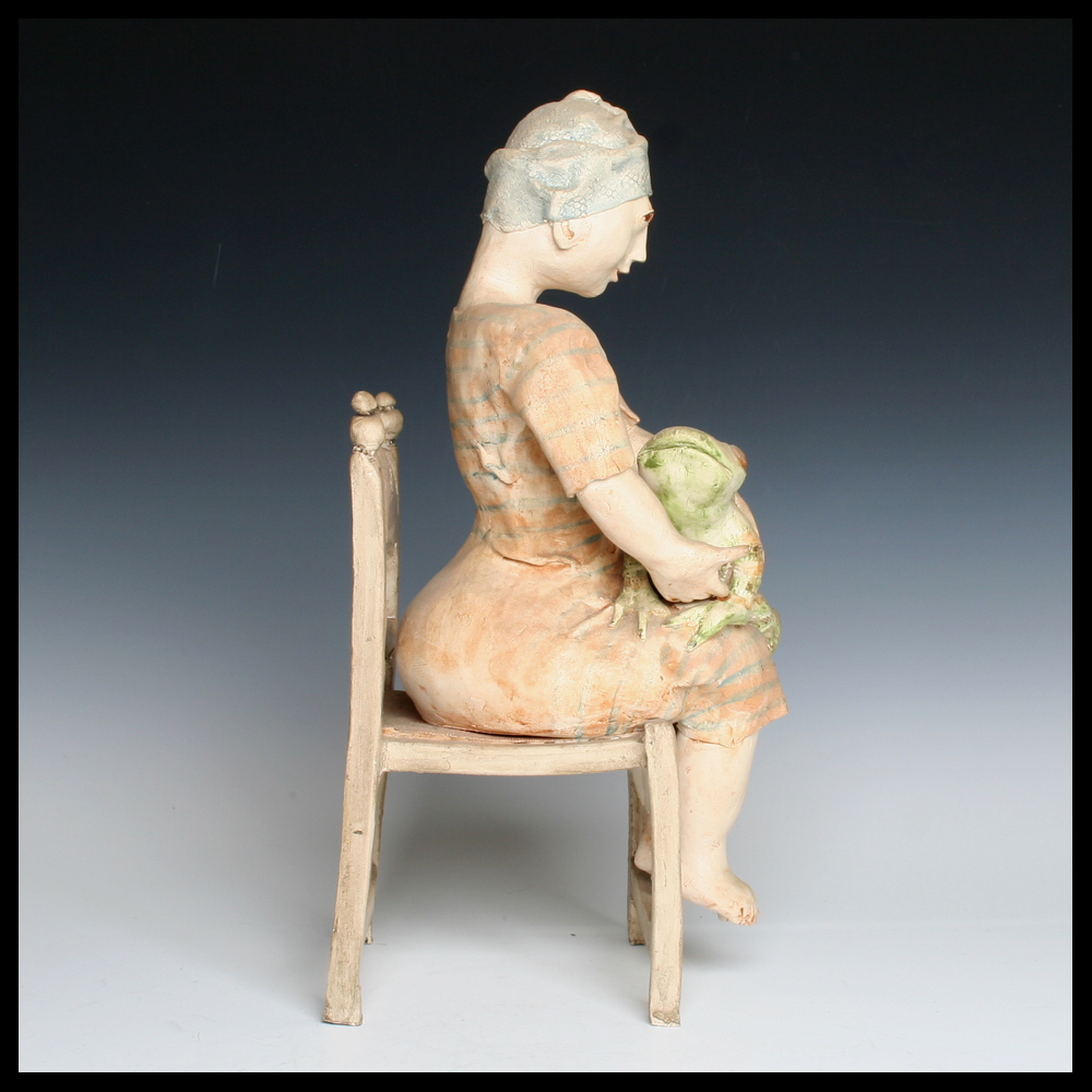 Lies van Vlijmen (NL), zittende vrouw met kikker op schoot, met de hand geboetseerd, hoogte 37,5 cm, breedte 16,5 cm, diepte 20 cm, 1978. Dit object is uit de collectie van Otto Schaap en aangekocht bij Galerie Petit iin Amsterdam. Dit object alleen afhalen of bezorgen in Nederland.