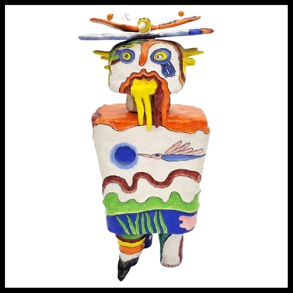 Maggi Giles (UK/NL), kleurrijk groot sculptuur “Old Father Time / Vadertje tijd, geboetseerd, geglazuurd met intensieve kleuren tussen ‘dijkjes’, hoogte 60 cm, breedte 27 cm, diepte 17,5 cm, werknummer 604, geschilderde signatuur, 1987. Dit object staat afgebeeld in Maggi Giles, Longing for the perfect planet, 2005, p.23. Opmerking: kleine restauratie aan een van de oranje vleugels van de vogel op het hoofd.