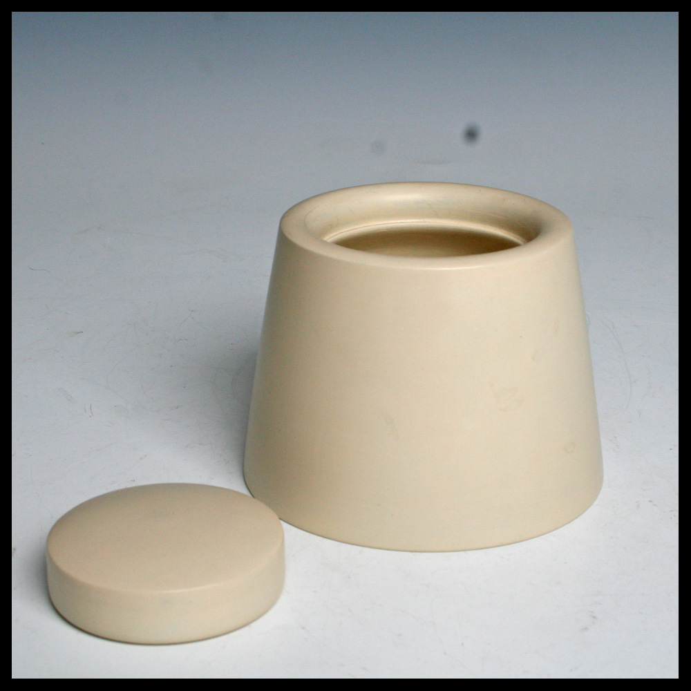 Maria van Kesteren (NL), taps toelopende dekseldoos, ivoorkleurig gelakt hout (iep of populier), hoogte 10,5 cm, diameter onderzijde 11,7 cm, brandmerk onderzijde, circa 1980.