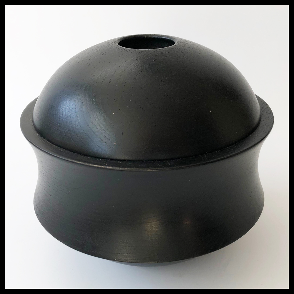 Maria van Kesteren (NL), zwart gebeitste dekseldoos, hout, gedraaid, hoogte 16,6 cm, diameter 17,5 cm, signatuur gebrandmerkt, ca. 1975. Provenance: collectie De Jong-Kulsdom.