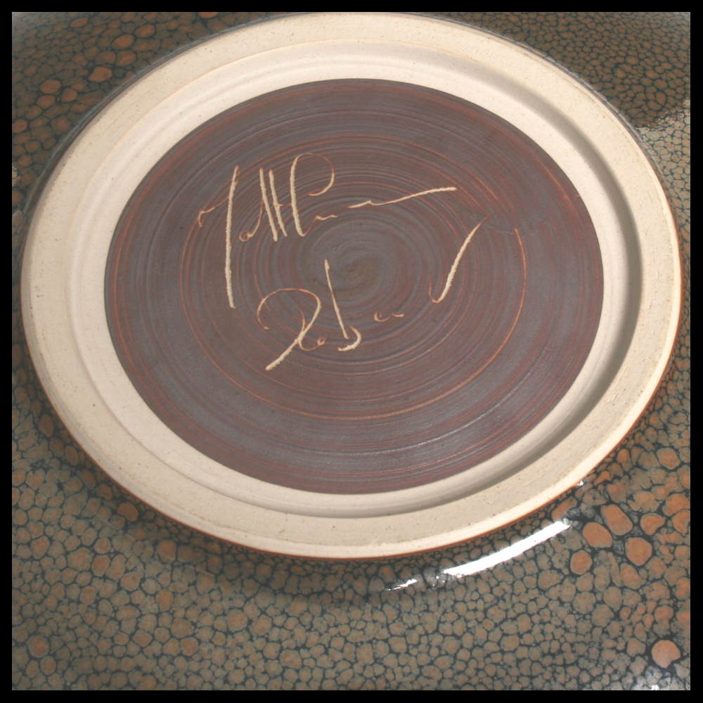 Matthieu Robert (FR) – de pottenbakker laat bij deze zeer grote lage kom een mooie proeve van grote bekwaamheid zien. Handgedraaid, steengoed, hooggestookt, aan de buitenzijde drie onderglazuur ribbels, een mooie levendige ‘oilspot’ glazuur. Hoogte 10 cm, diameter 29 cm, 2000s. PS. de donkere rand aan de bovenzijde is veroorzaakt door de belichting tijdens het fotograferen.