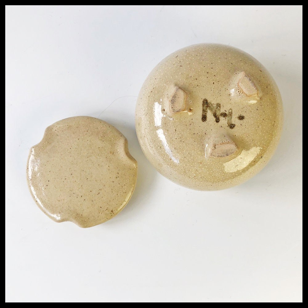 Nel Houtman (NL), dekseldoosje, op de schijf gedraaid, glanzende crême kleurige glazuur, drie ‘noppen’ in blauw en bruin, dekseltje met drie duim indrukken, hoogte 7,3 cm, diameter 8,5 cm, geschilderde signatuur, 1950s-1960s. Provenance: collectie E.Schuurman-Henny.