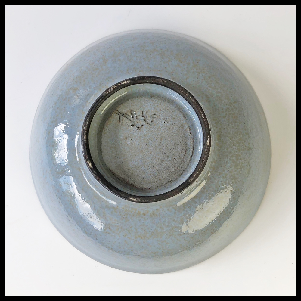 Nel Houtman (NL), schaaltje, op de schijf gedraaid, afgedraaide voet, fraaie grijs-blauwe hoogglans glazuur, hoogte 5,8 cm, diameter 16,7 cm, ingekraste signatuur NH, 1950s-1960s. Provenance: collectie E. Schuurman-Henny.