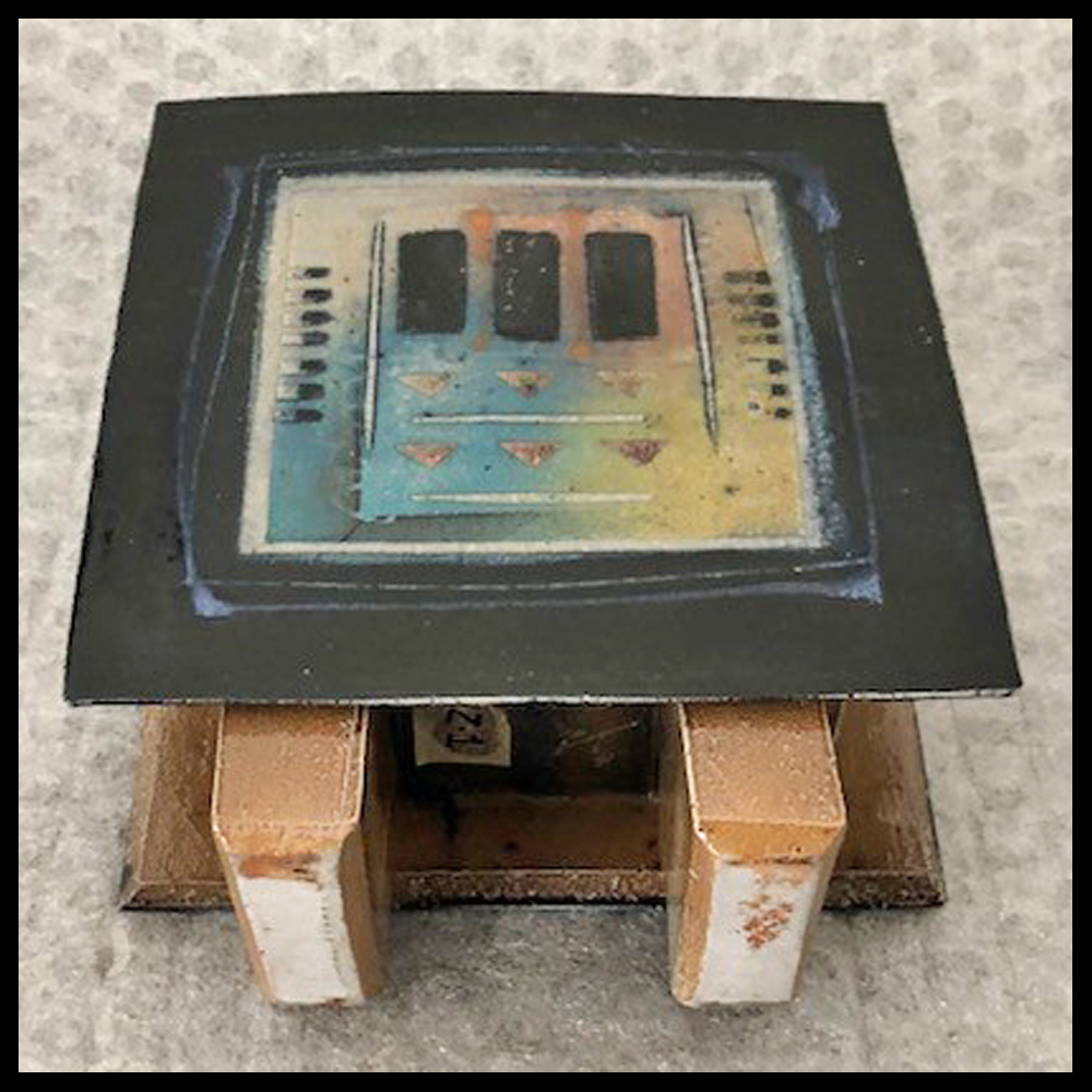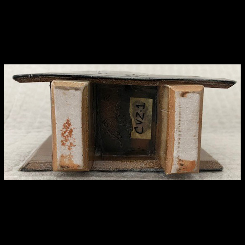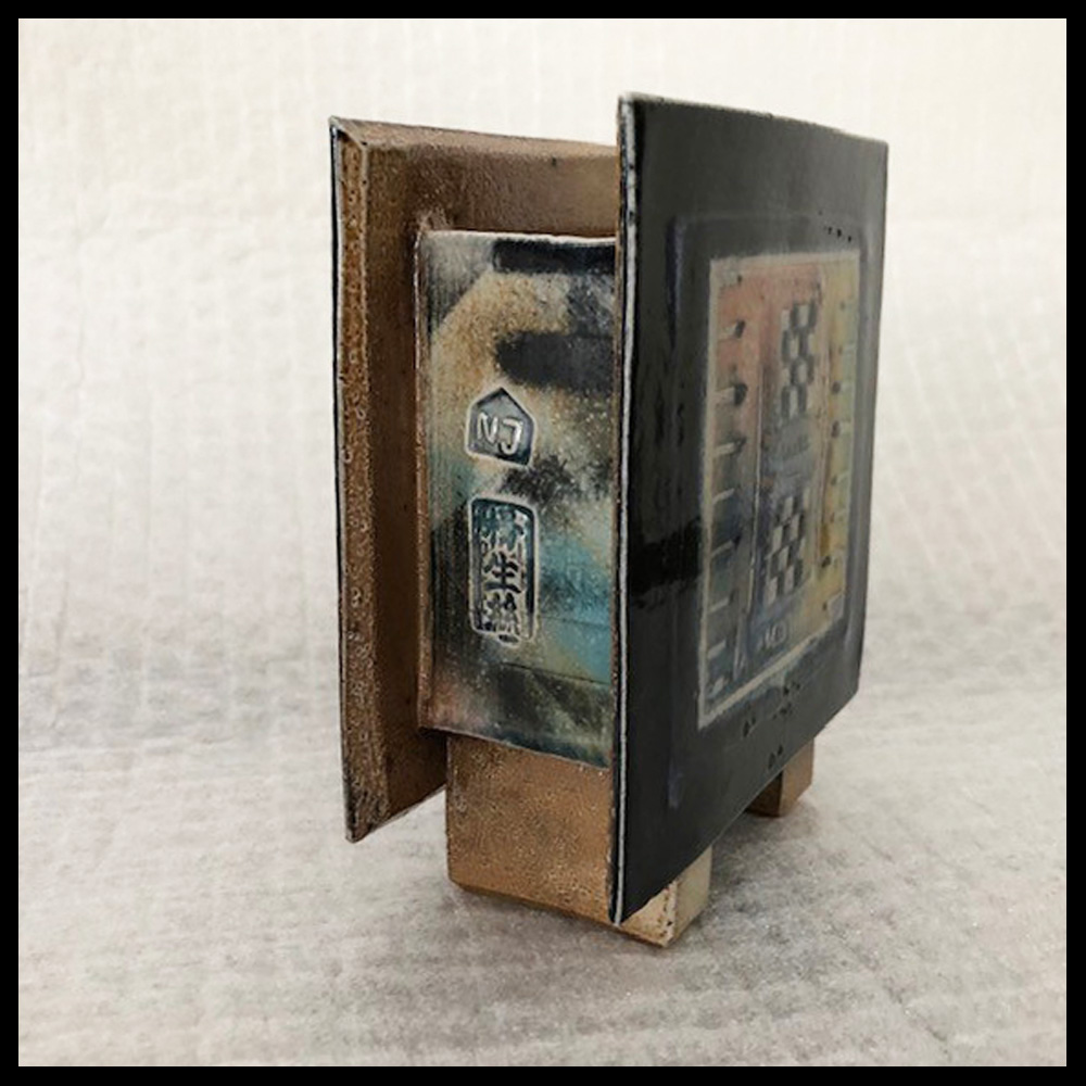 Netty Janssens (NL), rechthoekige pot op twee pootjes, uit platen opgebouwd, steengoed, met decoraties, gestempelde en ingekraste signatuur, hoogte 13,5 cm, breedte 11,7 cm, diepte 5,4 cm, 2000s.