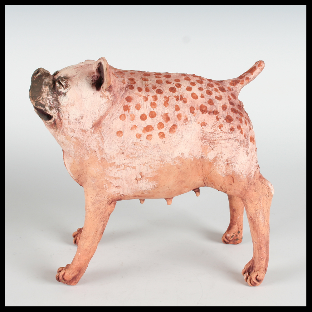 Peter Vanbekbergen (BE) – keramische skulptuur van een gevlekte mopshond, na het stookproces gekleurd met engobes, 1990s, fraai en zonder schade.