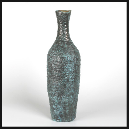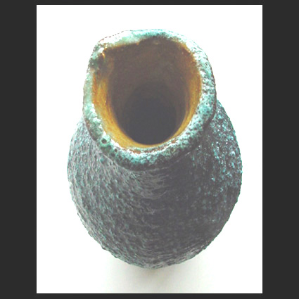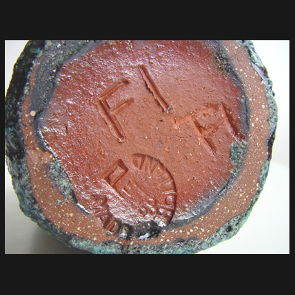 Truus ter Haar (NL), een prachtige, met de hand opgebouwde a-symmetrische, ietwat afgeplatte vaas met een onregelmatige mond. Roodbakkende scherf. De binnenzijde heeft een okerkleurige gladde glazuur. De zwart-blauwe glazuur aan de buitenzijde is vermengd met zilverzand. Hierdoor heeft de huid een ruw opervlakte. De vaas is gemaakt bij Pieter Groeneveldt Atelier in Voorschoten. De uitvoering is gedaan door Truus ter Haar. Gesigneerd TH. Lees meer over Pieter Groeneveldt en Truus ter Haar in het belangwekkende artikel van Robbert de Vries en Olivier Nieuwenhuyse in Vormen uit Vuur, 217, 2012.