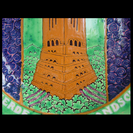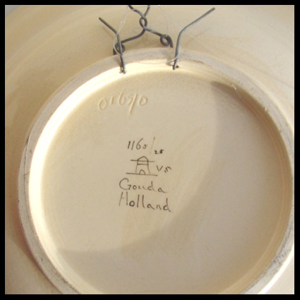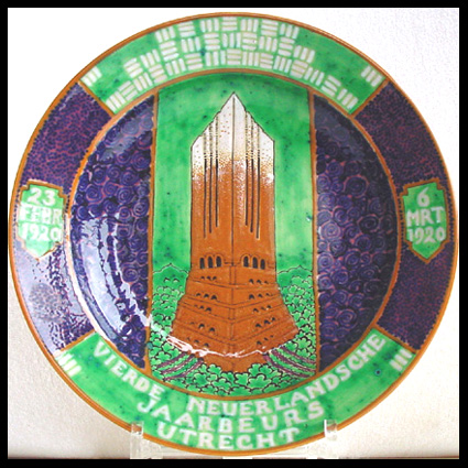 Van de Plateelbakkerij Zuid-Holland te Gouda dit herinneringsbord ter gelegenheid van de Vierde Nederlandsche Jaarbeurs Utrecht, van 23 februari tot 6 maart 1920. Boven een soort – art deco – streepjes code en centraal een fantasiegebouw der vooruitgang. De kunstenaar Frans ter Gast is ontwerper van de poster voor deze Jaarbeurs. Delen van de poster zijn overgenomen op dit bord. De ontwerper is daarmee dus Frans ter Gast. Zie het boek: Ontwerpen voor de Jaarbeurs. Met veel dank voor deze informatie aan Rob Geutjes! From the Plateelbakkerij (faience pottery) Zuid-Holland in Gouda, this commemorative plate for the occasion of the Fourth Annual Netherlands Exhibition Utrecht, from 23rd February to 6th March 1920. Above a kind of art deco bar code and centrally an imaginary building for advancement. The artist Frans ter Gast was designer of the poster for this annual exhibition. Parts of the poster have been transferred onto this part. The designer was therefore Frans ter Gast. Please refer to the book: Annual Exhibition Designs. Our many thanks for this information go to Rob Geutjes!