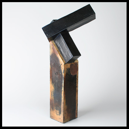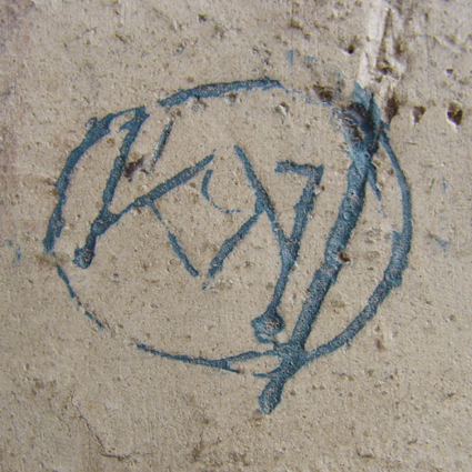 Een imposant aardewerk ruimtelijk plastiek, handgevormd. Licht roestige veldspaatglazuur met blauwzwarte vlekken op het sokkelgedeelte en blauwzwarte glazuur op de schuine delen. In deze periode heeft Van Renssen de krastechniek die hij bij De Porceleyne Fles in Delft ontwikkeld heeft, verlaten. Een foto uit Spruit-Ledeboer, Nederlandse keramiek 1900-1975. p. 273 toont een variant uit hetzelfde jaar, welke zich bevindt in de collectie van het Stedelijk Museum te Amsterdam. Objectkaart met volledige beschrijving op aanvraag.