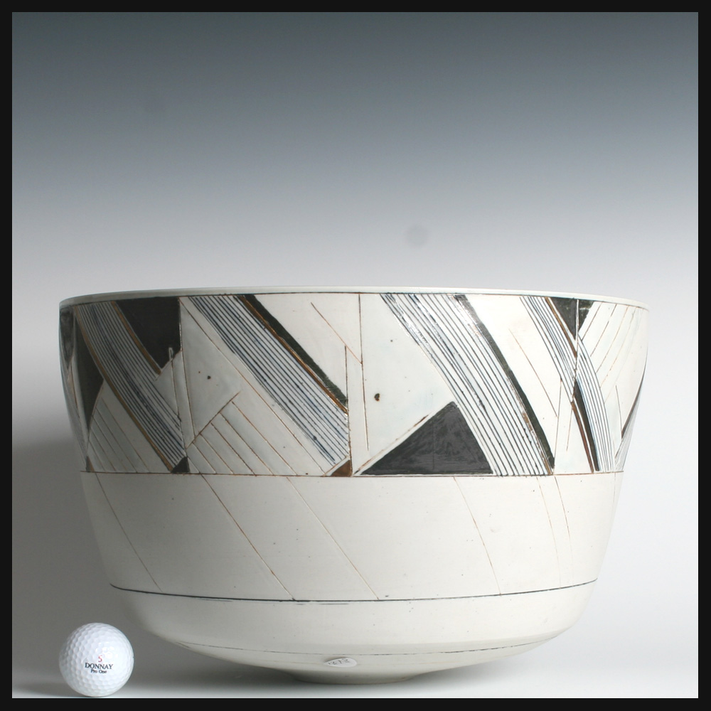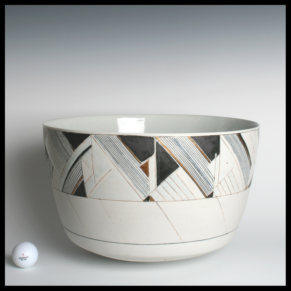 Gerd Hiort Petersen, echtgenote van Hans Munck Andersen, maakt op het eiland Bornholm (DK) grote schalen geïnspireerd op het rotsachtige landschap. Daarnaast maakte zij in de jaren tachtig porselein kommen in alle mogelijke maten. Daarin laat zij haar grafische talenten zien. De hier aangeboden kom is mogelijk de grootste die zij ooit heeft gemaakt. De kom weegt ongeveer 6 kilo. De diagonale lijnen zijn ingekrast, opgevuld en ten dele met goudlijnen verhoogd. Ook zijn ontstane driehoekjes voorzien van een witte tinglazuur. Dit stuk heeft de kwaliteit om in een museumcollectie te worden opgenomen. Zie voor meer informatie over de kunstenaar de film op you tube: https://www.youtube.com/watch?v=cs5b2qJXBV4