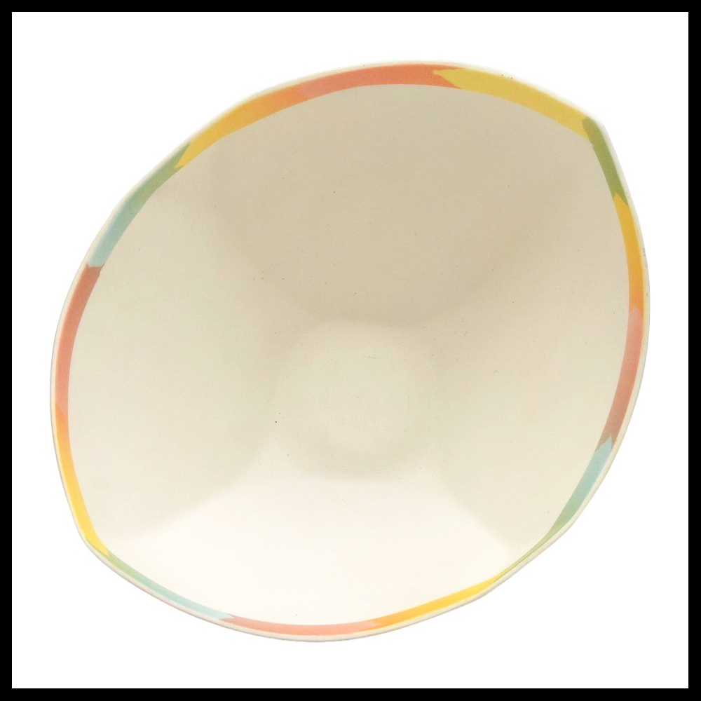 Sasha Wardell (UK), ovale hoekige komvorm met pastelkleurige strepen, Bone China porselein, hoogte 11cm, breedte 21cm, diepte 18cm, circa 1990.