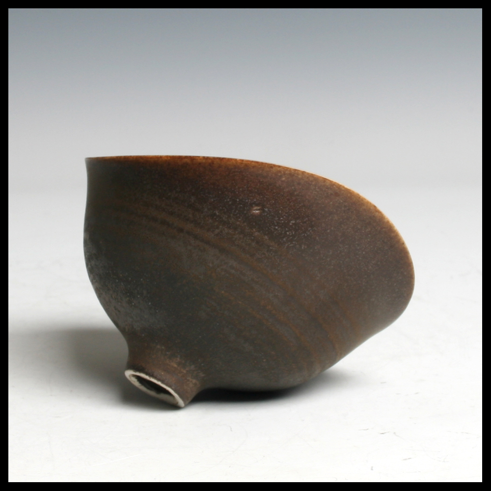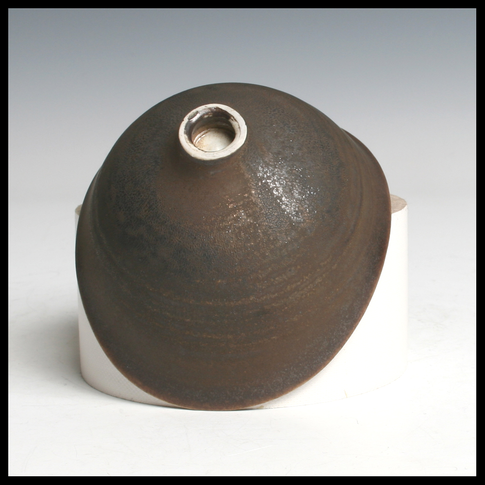 Shirley Doonan (UK), elegant ovaal kommetje op hol voetje, porselein, bronskleurige glazuur buitenzijde, binnenzijde bruin naar rode matte glazuur, hoogte 5,6 cm, breedte 10,5 cm, diepte 9 cm, 1981. Dit object is door de eerste eigenaar aangekocht bij Galerie Troutzaerte te Westdorpe.