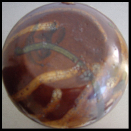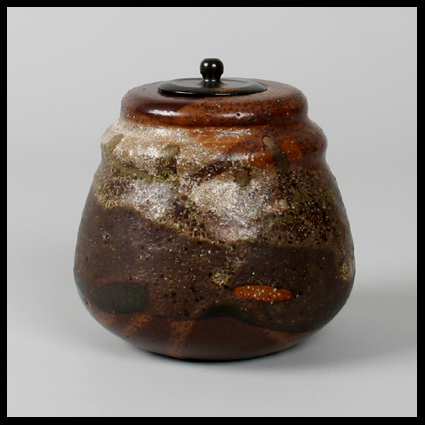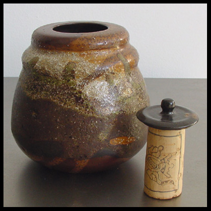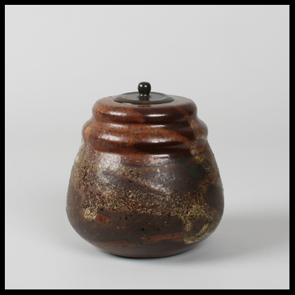 Sonja Landweer draaide dit dotje van een dekselpotje, met aan de bovenzijde een welving, horizontaal eindigend bij de mond. Na de eerste brand is het selectief overgoten met onder andere een glazuur vermengd met zilverzand. Daarna is de boven- en onderzijde gedompeld in een glanzende ijzerhoudende glazuur. Het gehele potje wordt daarmee bijzonder levendig. Er is een zeer verfijnd dekseltje bij, gemonteerd op een kurk.