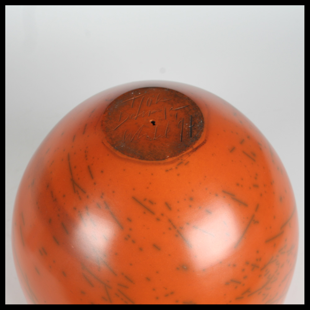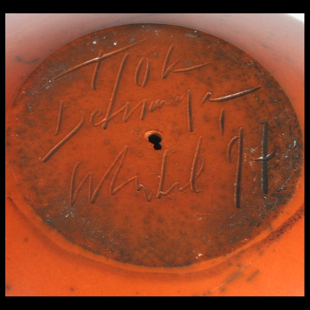 Tjok Dessauvage (BE) – gesloten potstructuur, handgdraaid, huid in terra sigillata, horizontale bovenzijde met ‘knikkerkuiltje’, ingekraste rechte lijnen en een ovaal die eindigt in een wit contraststukje, gesigneerd onderzijde en gedateerd 1997.