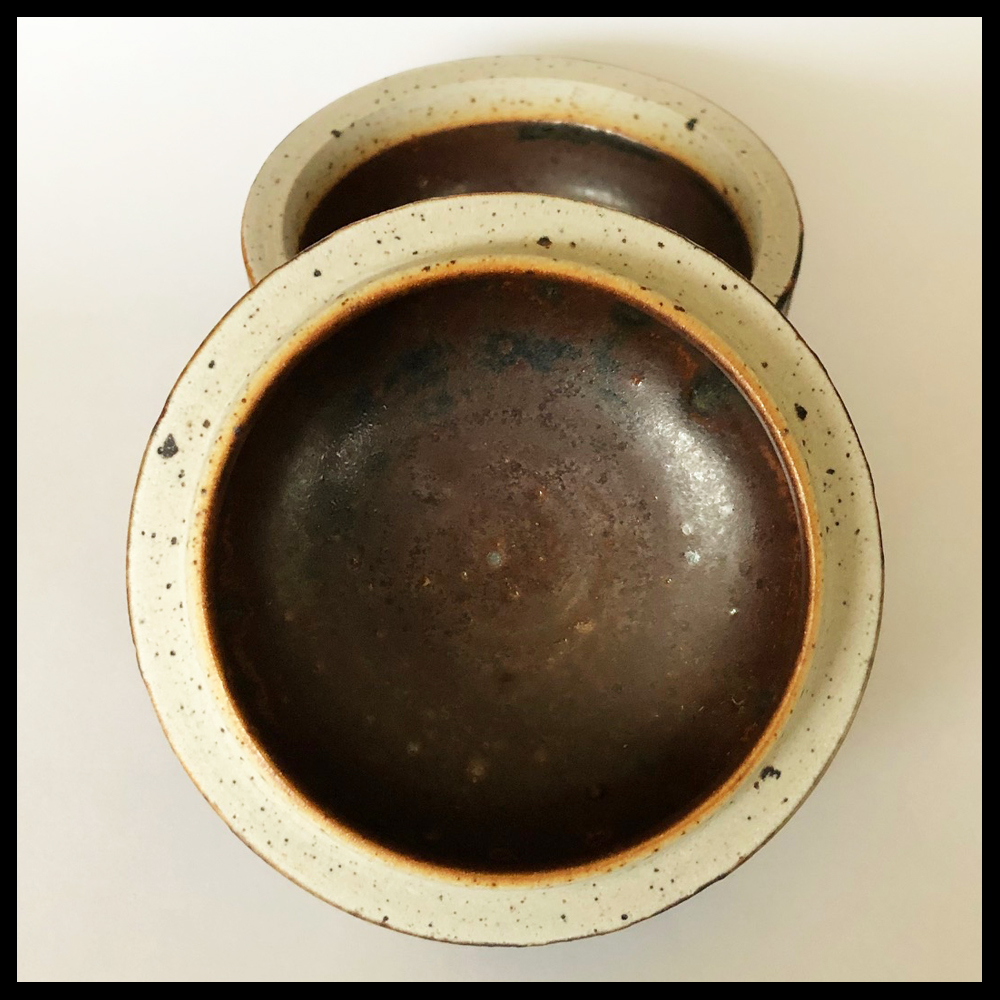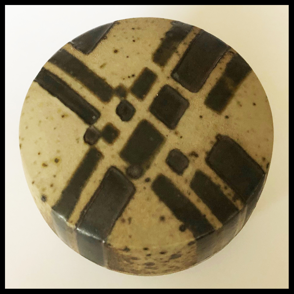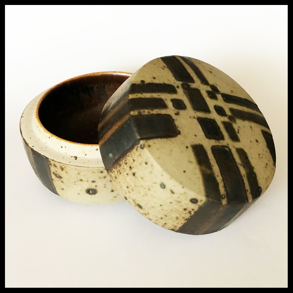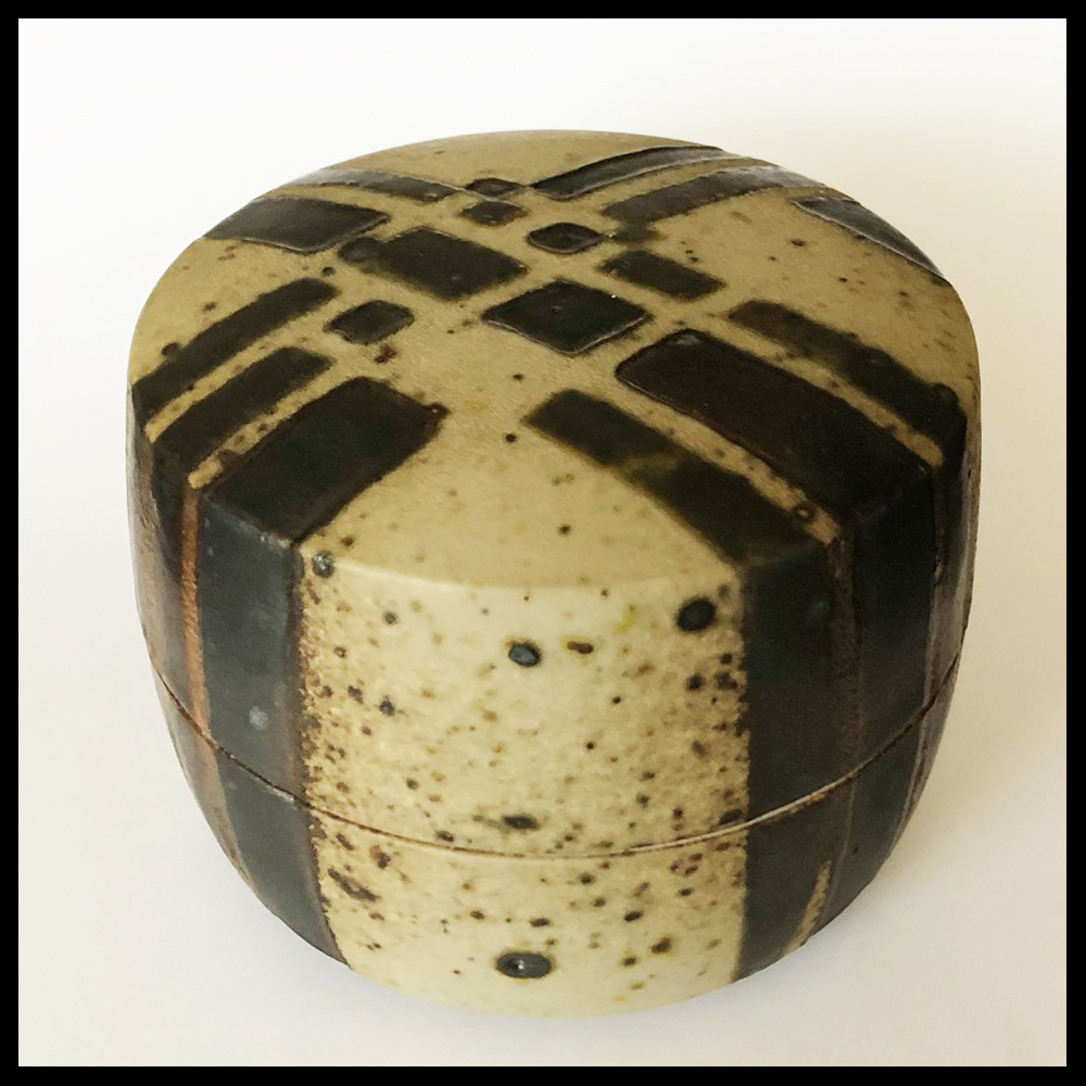 Ursula Scheid (DE), perfect gemaakt dekseldoosje, op de schijf gedraaid, steengoed, geometrisch banddecor in brons met insluitingen, hoogte 7,5 cm, diameter 9,3 cm, 2004. Opmerking: De opnamen zijn iets geler dan in werkelijkheid.