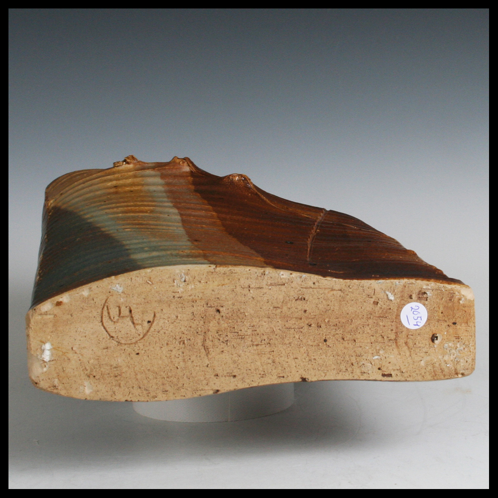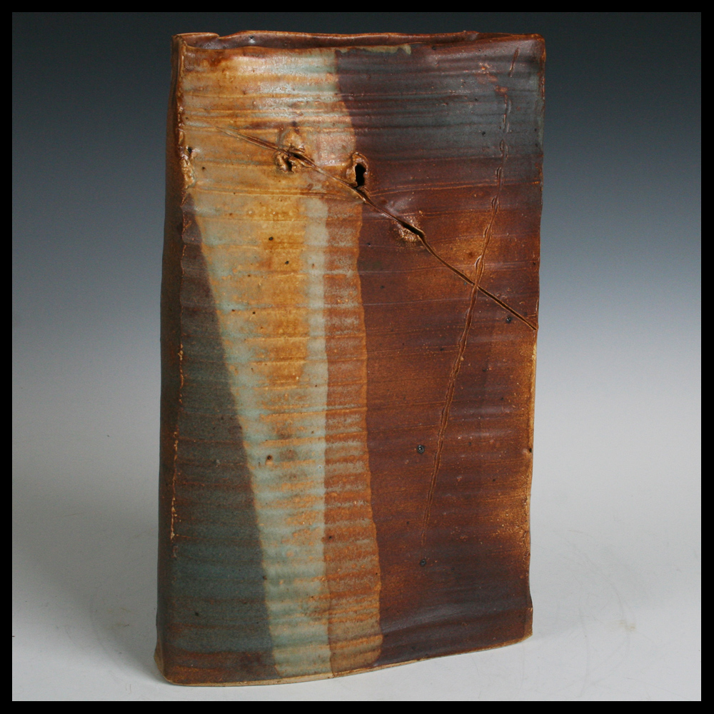 Vilma Henkelman (NL), platte vaasvorm met ribstructuur, op de schijf gedraaid, daarna vervormd, steengoed, voorzijde met krassen en gaten, geïnspireerd op het werk van de Amerikaan Peter Voulkos (1924-2002), die zij in de jaren 1980s in Amerika ontmoet. Fraaie glazuren in bruintonen met pastel blauw, hoogte 32,5 cm, breedte 20,2 cm, diepte 6 cm, 1980-1990. Herkomst Nederlandse privé collectie.