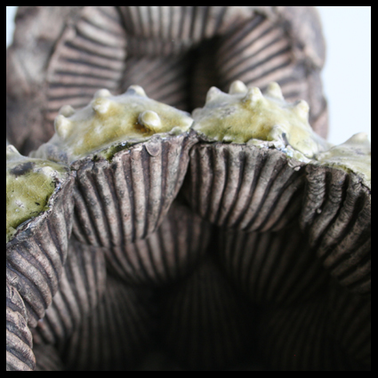 Wietske van Leeuwen heeft dit bijzondere stuk in opdracht van de eerste eigenaar gemaakt. Het werd aangekocht via Galerie Terra in Delft. Heel zorgvuldig opgebouwd uit zeevruchten en keramische kokkels. Ook aan de binnenzijde, waardoor het interieur gecapitoneerd lijkt.