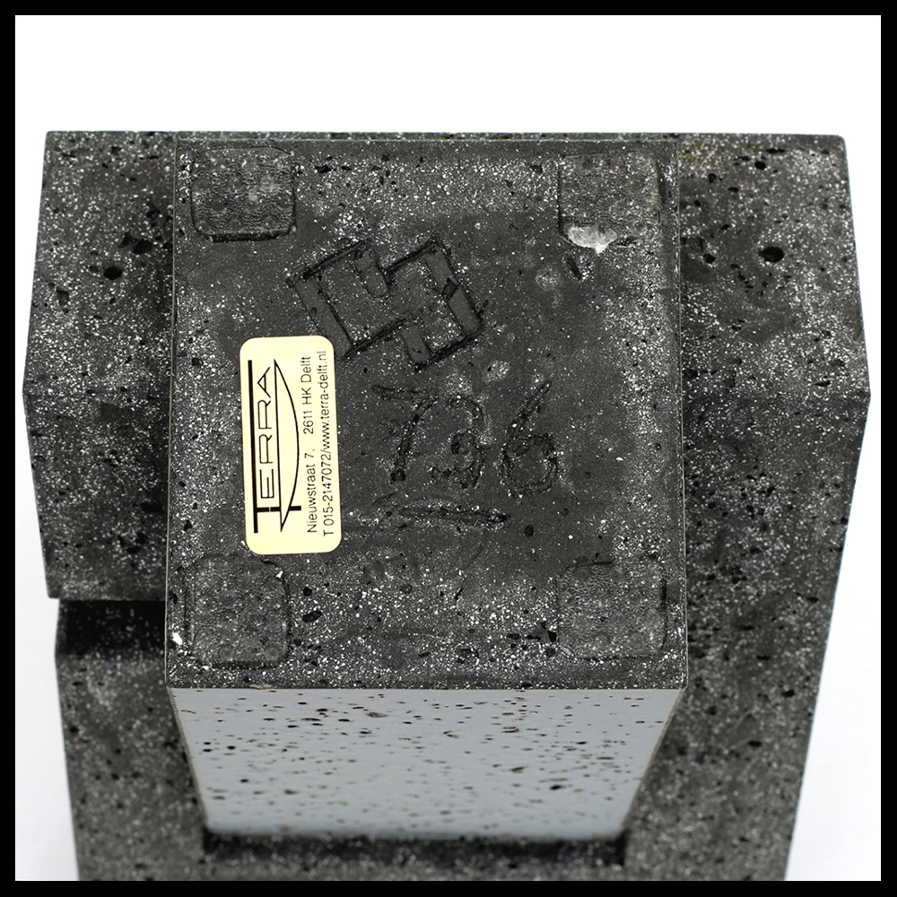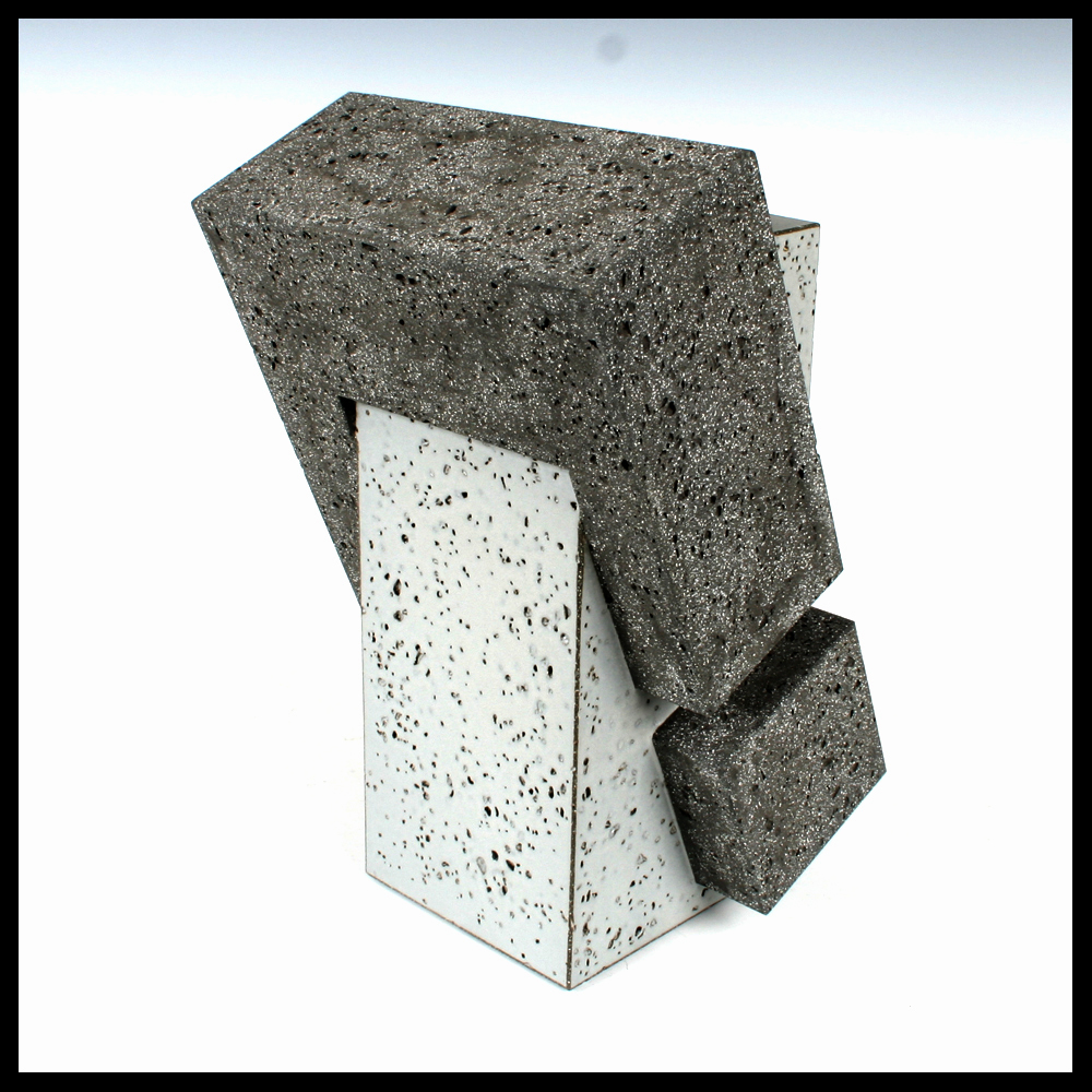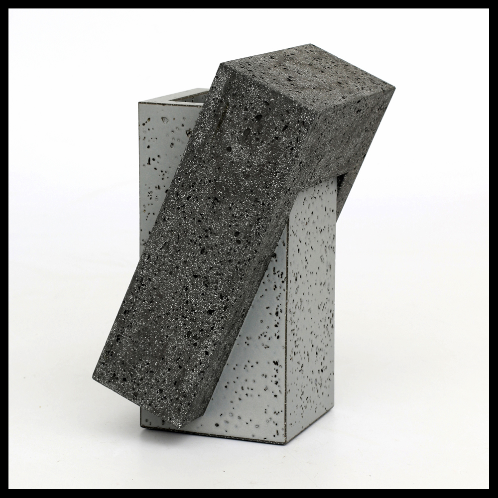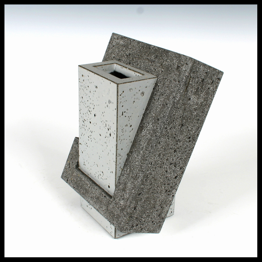 Wim Borst (NL), intrigerende constructie van een rechthoekige vaasvorm in lichtgrijze matte glazuur, daar om heen geklemd een diagonaal geplaatst raamwerk met een doorbreking aan de zijkant in donkergrijze matte glazuur, de huid heeft een open structuur maar is ook gepolijst, hoogte 24,6 cm, breedte 15,8 cm, diepte 10,4 cm, werknummer 736, 2000s. Dit object is door de eerste eigenaren aangekocht bij Galerie Terra te Delft.