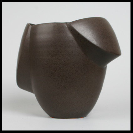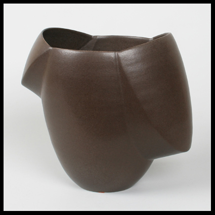 Wouter Dam experimenteert al vroeg in zijn carrière met nieuwe (container) vormen, waarbij hij voorgoed los breekt uit de louter gedraaide ronde vorm. Bij dit perfect gemaakte object is hij uitgegaan van de gedraaide steengoed vorm, waarin hij twee lussen heeft uitgesneden. Deze heeft hij vervolgens naar buiten uitgeklapt en gemonteerd. steengoed, witbakkende klei met een bruine matte glazuur.