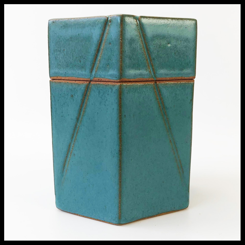 Henriëtte Syatauw (NL), zeskantige dekseldoos,uit platen klei steengoedklei opgebouwd, met ingekraste geometrische lijnen, fraaie turquoise semi matte glazuur, lijn accentuering in roest, hoogte 14 cm, diameter 9,5 cm, ingekraste signatuur, 1986. Dit object is door de eerste eigenaren aangekocht bij Galerie De Sluis te Leidschendam
