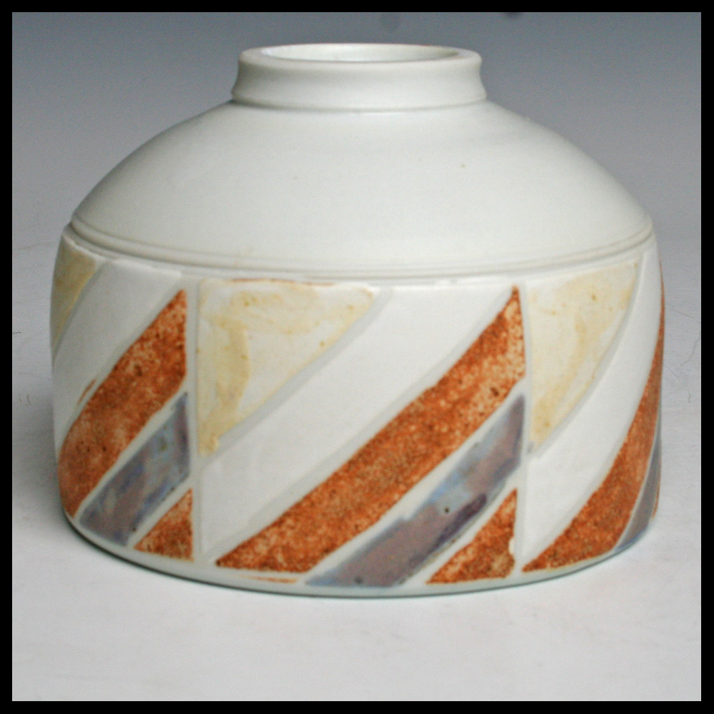 Joop Crompvoets (NL), kom op voet, op de schijf gedraaid, porselein, de buitenwand is in blokken verdeeld met ingekraste verticale lijnen, daar binnen zijn diagonale lijnen ingekrast, deze zijn ingekleurd met matte glazuren, binnenzijde transparante hoogglansglazuur, hoogte 10 cm, diameter 13 cm, gestempeld monogram, 1990.