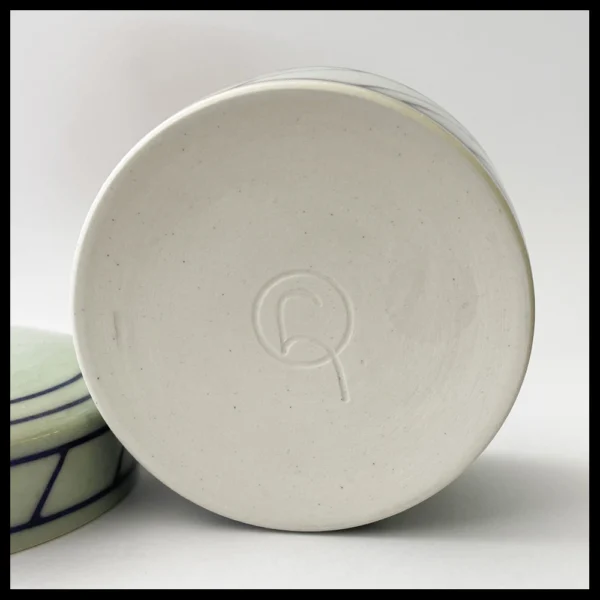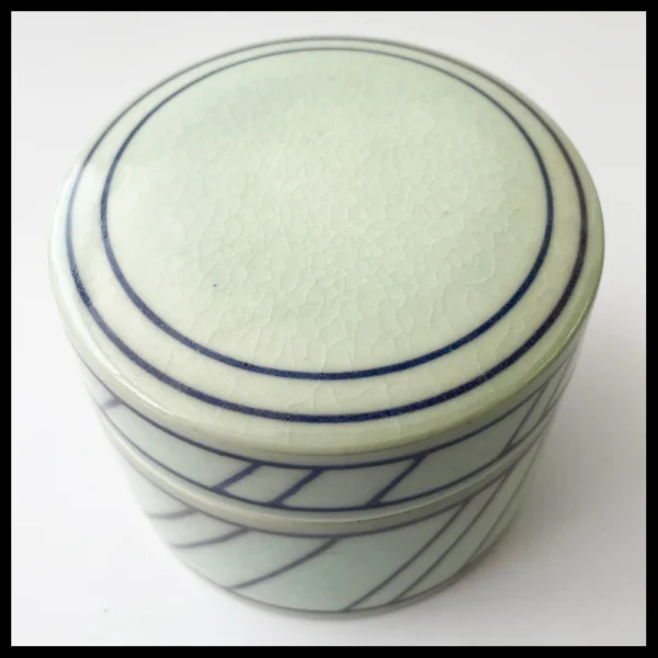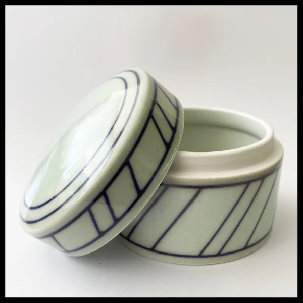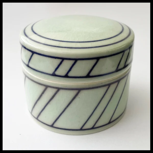 Leen Quist (NL), klein dekseldoosje, porselein, op de schijf gedraaid, zeer lichtgroene glazuur met ingekraste diagonale lijnen, opgevuld met een donkerblauwe engobe en afgedekt met een transparante glazuur met fijne craquelure, hoogte 5,4 cm, diameter 6,8 cm, 1980s-1990s.